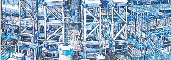He sees some similarity between the natural world of the forest and that of the engineering yard or ship workshop. Above we see the complicated scaffolding, pipes and cables going every which way and we can perhaps see some likeness in the branches and growth deep in an old forest. The trees and plants also twist and grow themselves into long and winding shapes of nature. There are fewer straight lines in nature though.